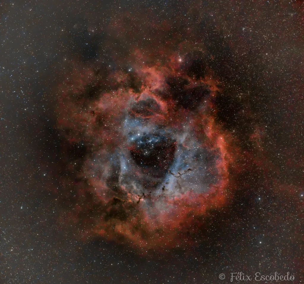 La nébuleuse de la Rosette, aussi connue comme Caldwell 49, est une vaste région HII située à quelque 4700 années-lumière4 du système solaire en direction de la constellation de la Licorne.