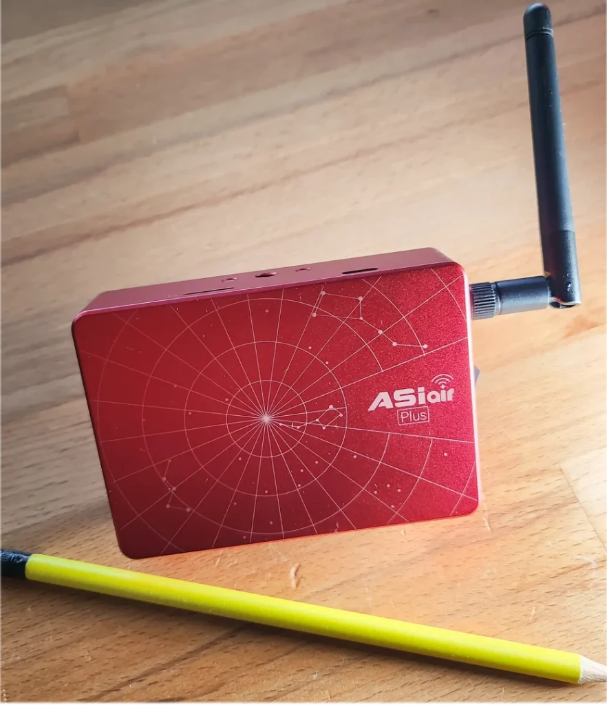Le boitier de l’ASIAIR Plus est en aluminium usiné par CNC et anodisé rouge du plus bel effet. Le boitier mesure 100x70x26,5mm et ne pèse que quelques centaines de grammes, ce qui le rend plus fin de 24% et plus léger de 13%.
