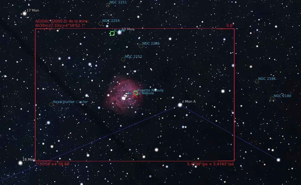 La nébuleuse de la Rosette NGC2237, aussi connue comme Caldwell 49, est une vaste région HII située à quelque 4700 années-lumière4 du système solaire en direction de la constellation de la Licorne. NGC 2237 a été découvert par l’astronome américain Lewis Swift en 1865.